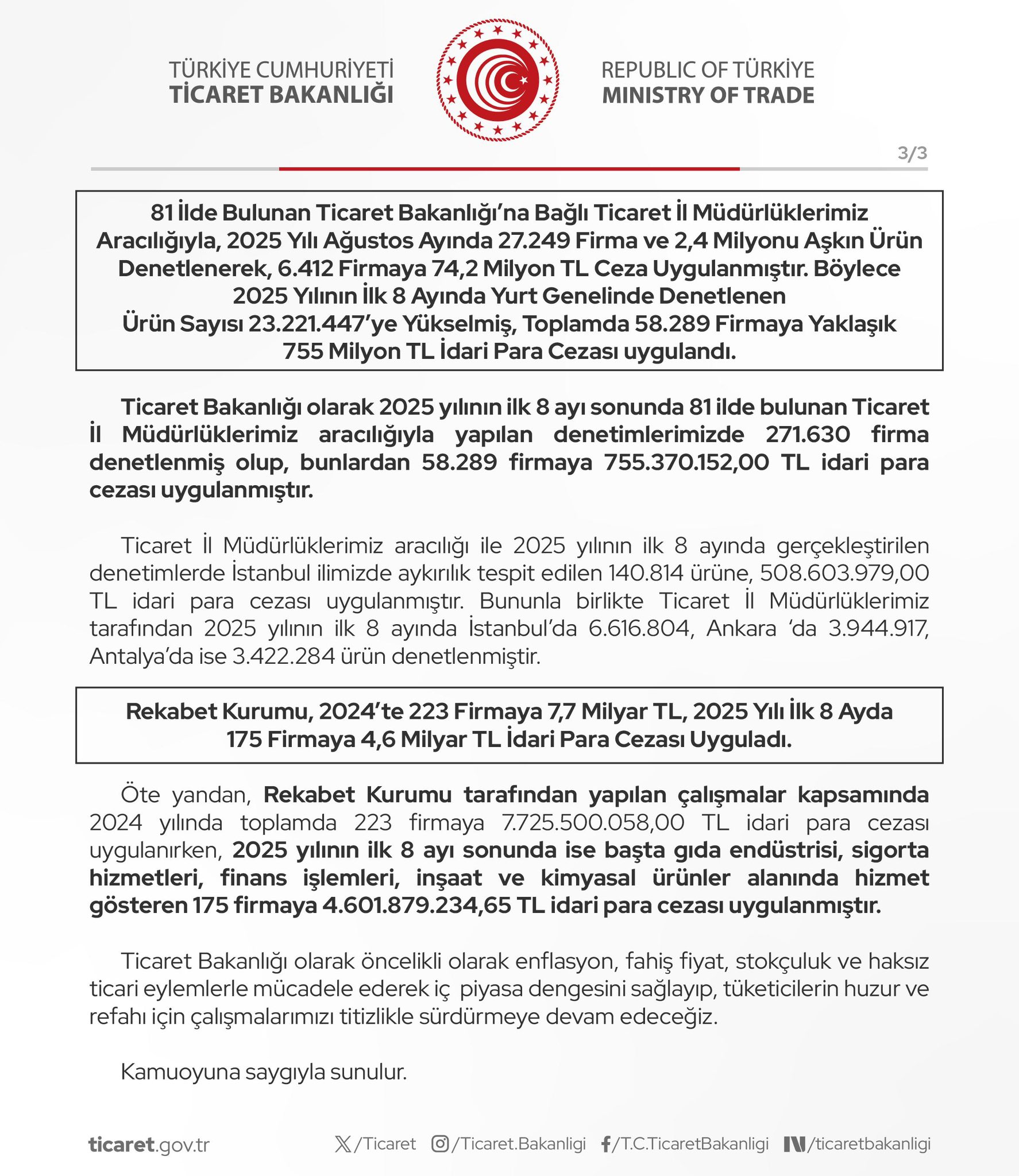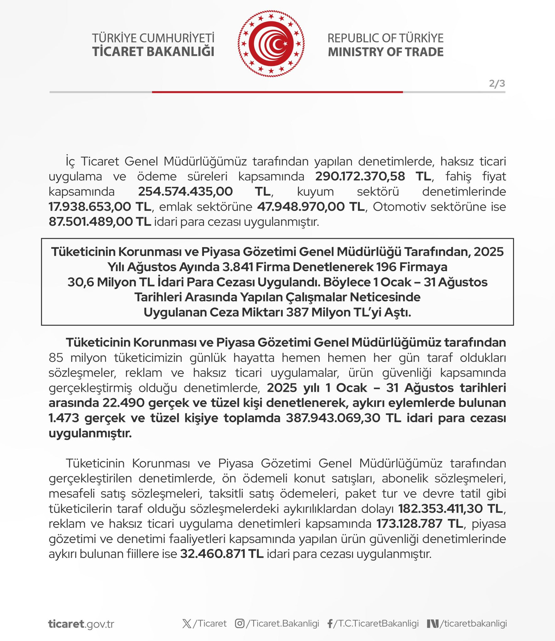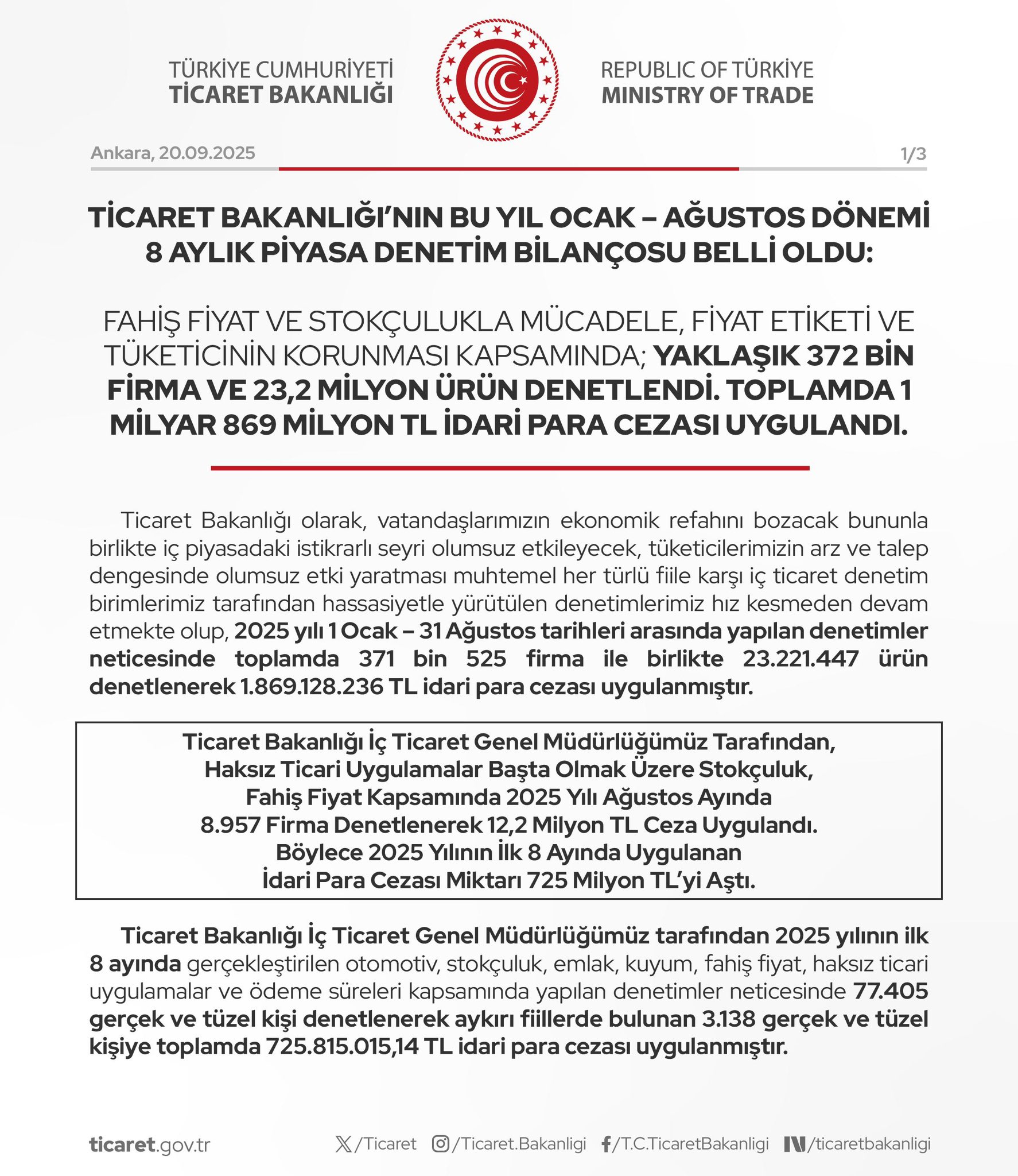 Bakanlık verilerine göre, 1 Ocak – 31 Ağustos 2025 tarihleri arasında 371 bin 525 firma ve 23 milyon 221 bin 447 ürün denetlendi. Bu denetimler neticesinde toplam 1 milyar 869 milyon 128 bin 236 TL idari para cezası kesildi.