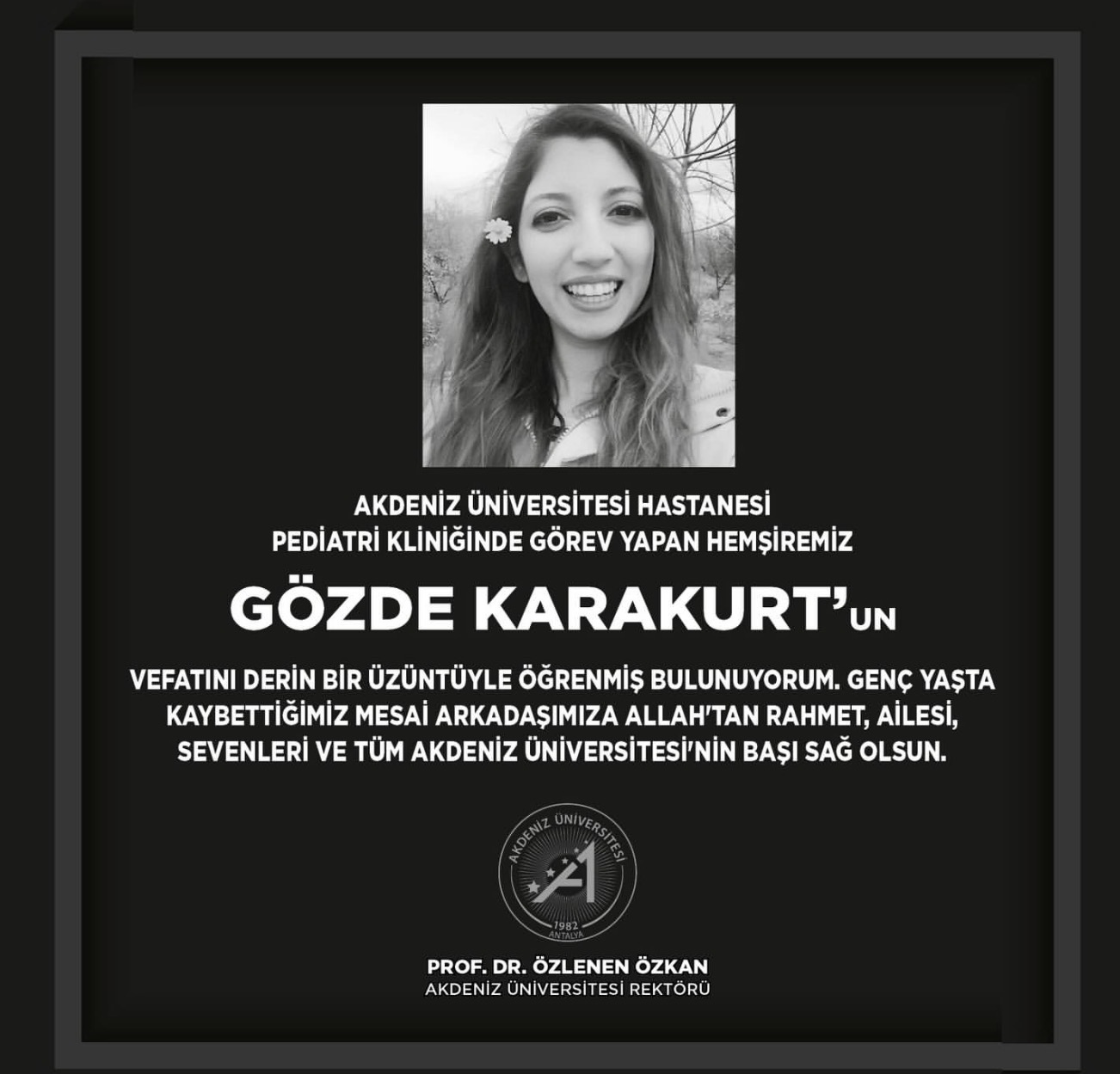 “Hastanemiz, Pediatri Kliniği’nde hemşire olarak görev yapan Gözde Karakurt’un vefatını derin bir üzüntüyle öğrenmiş bulunuyoruz. Merhumeye Allah’tan rahmet, ailesi, sevenleri ve yakınlarına başsağlığı dileriz.”