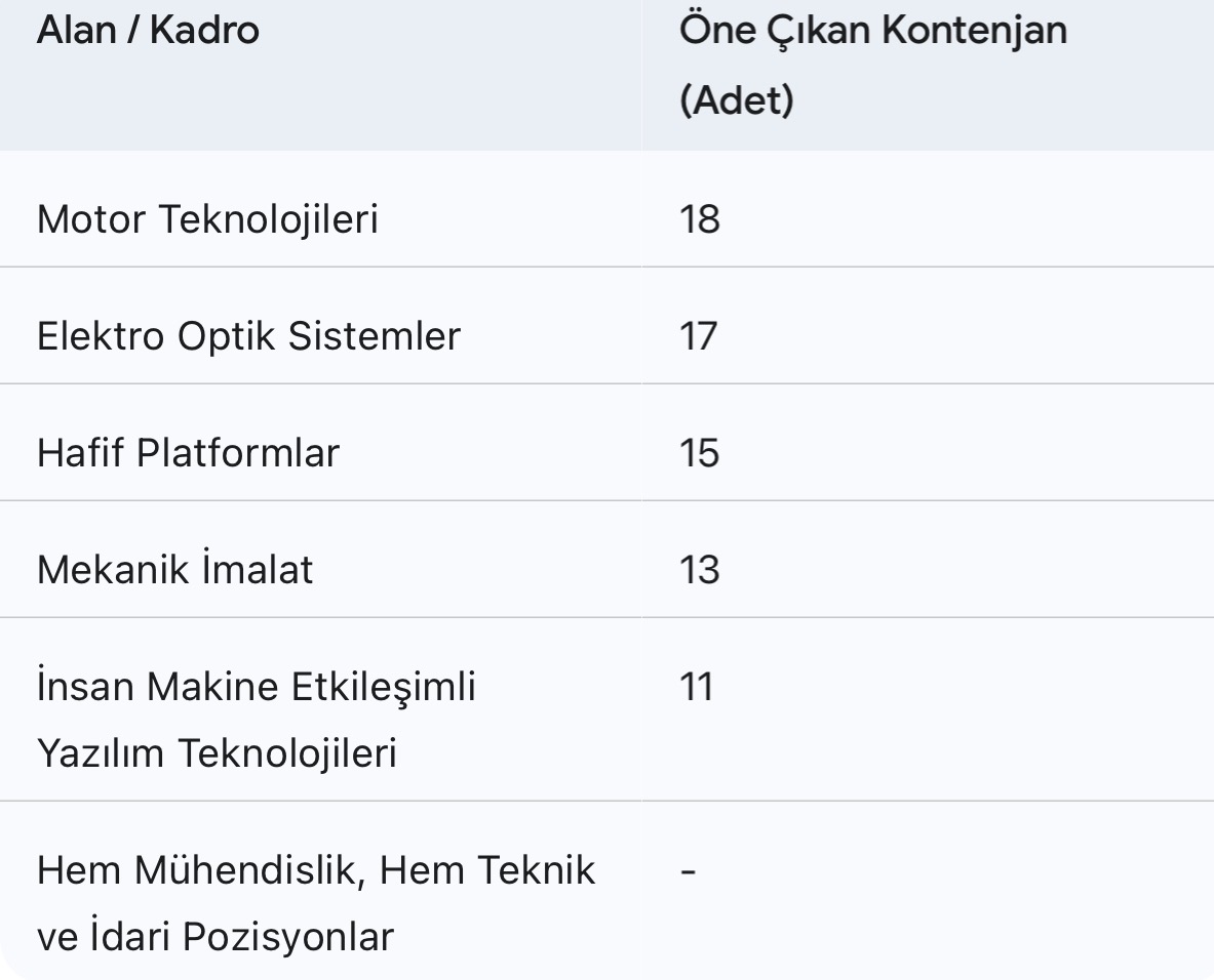 Baykar, hem mühendislik hem de destek personel kadrolarında, en az lise mezunu adaylar dahil olmak üzere geniş bir yelpazede istihdam sağlayacak. En çok alım yapılacak departmanlar ve öne çıkan kadrolar şunlardır: