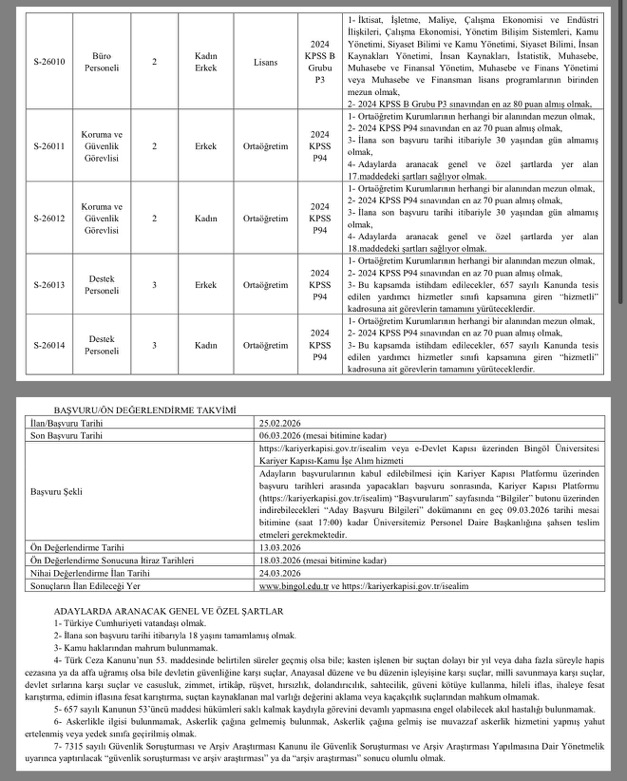 Bingöl Üniversitesi’nin Personel Alımında En Dikkat Çekici Nokta, Puan Barajlarının Erişilebilir Seviyede Tutulması Oldu. Destek Personeli Pozisyonları İçin 60 KPSS Puanı Yeterli Görülürken; Büro Personeli, Tekniker Ve Koruma Güvenlik Görevlisi Gibi Nitelikli Kadrolar İçin 70 KPSS Puanı Taban Olarak Belirlendi. Bu Düzenleme, Sınavdan Orta Düzeyde Puan Alan Ancak Kamuda Kariyer Hedefleyen Genç Adaylar İçin Önemli Bir Fırsat Olarak Değerlendiriliyor.