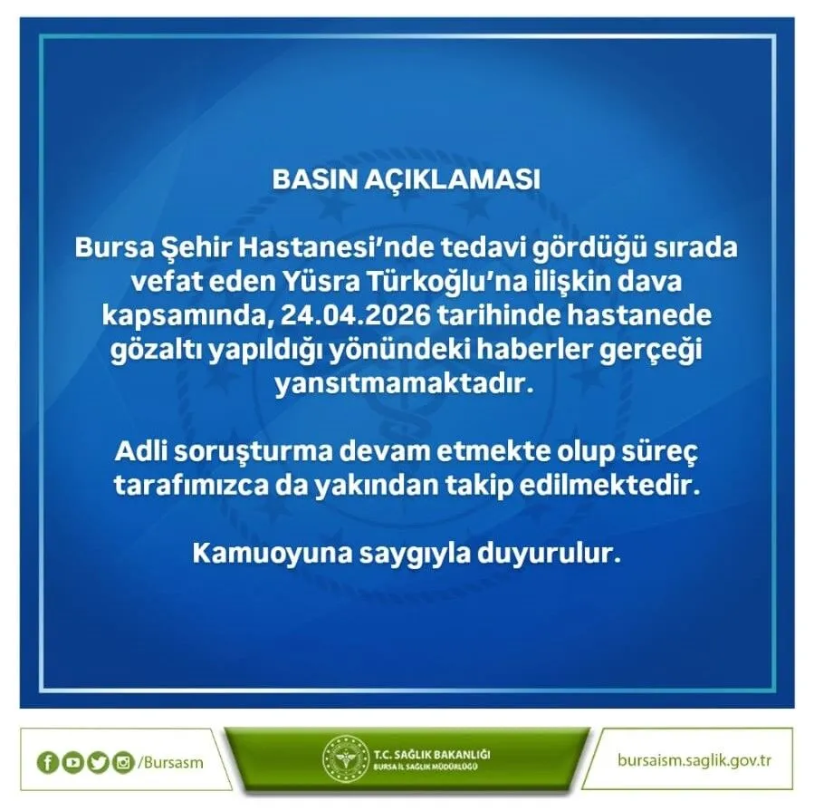 Bursa İl Sağlık Müdürlüğü, Bursa Şehir Hastanesi’nde yaşanan ve kamuoyuna yansıyan vefat olayıyla ilgili basında çıkan iddialara açıklık getirdi. Hastanede tedavi gördüğü esnada hayatını kaybeden Yüsra Türkoğlu’na ilişkin yürütülen dava süreci kapsamında, bazı mecralarda yer alan “hastanede gözaltı yapıldı” şeklindeki haberlerin asılsız olduğu belirtildi. 24 Nisan 2026 tarihinde gerçekleştiği öne sürülen bu gözaltı iddialarının hiçbir şekilde gerçeği yansıtmadığı vurgulandı.