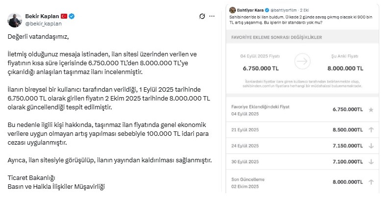 Ticaret Bakanlığı, emlak piyasasında fahiş ve manipülatif fiyat artışlarına karşı kararlılığını gösteren emsal bir karara imza attı. Sosyal medyadan gelen bir vatandaş şikayetini ihbar kabul eden Bakanlık, bir ev ilanında bir ay içinde sürekli ve mantıksız fiyat değiştiren ilan sahibine 100 bin TL idari para cezası uyguladı.