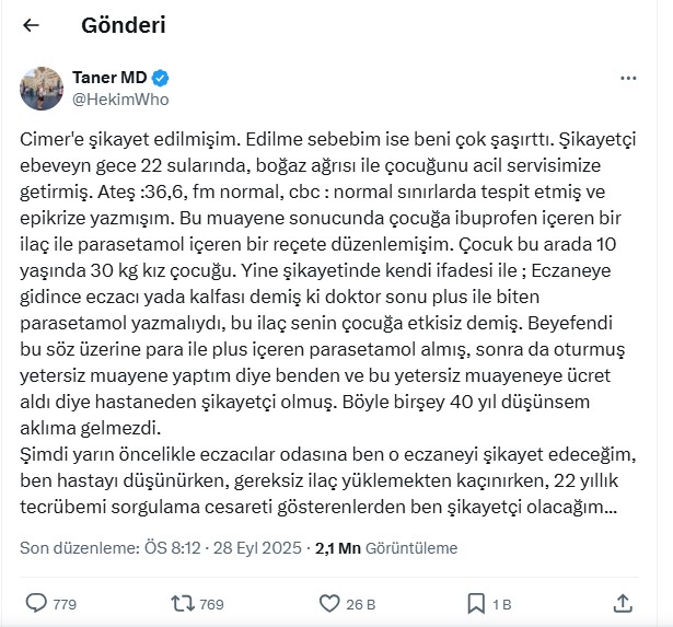Bir doktorun sosyal medya üzerinden yaptığı paylaşım, sağlık sektöründeki hekim-eczacı ilişkileri ve hasta şikayetlerinin geldiği boyutu gözler önüne serdi. Doktor, yazdığı reçete nedeniyle CİMER’e şikayet edilme gerekçesini “şaşırtıcı” olarak nitelendirdi ve duruma sert tepki gösterdi.