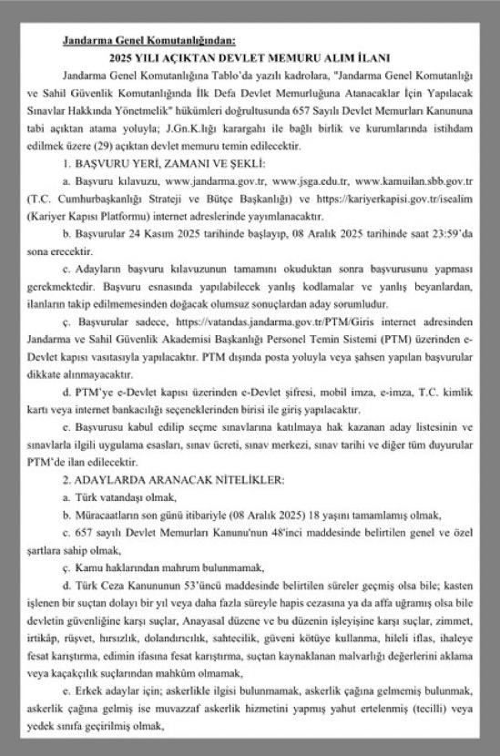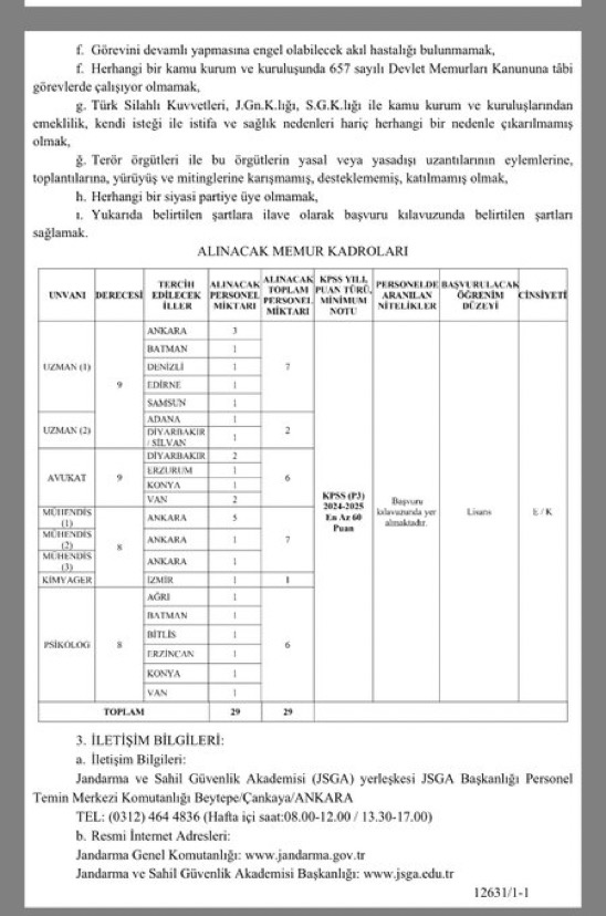 – Jandarma Genel Komutanlığı, farklı unvan ve derecelerde görevlendirilmek üzere toplam 29 sivil memur alımı yapacağını duyurdu. Alımlar, 657 Sayılı Devlet Memurları Kanunu hükümleri doğrultusunda, 2025 yılı KPSS puanı esas alınarak mülakat yoluyla gerçekleştirilecek.