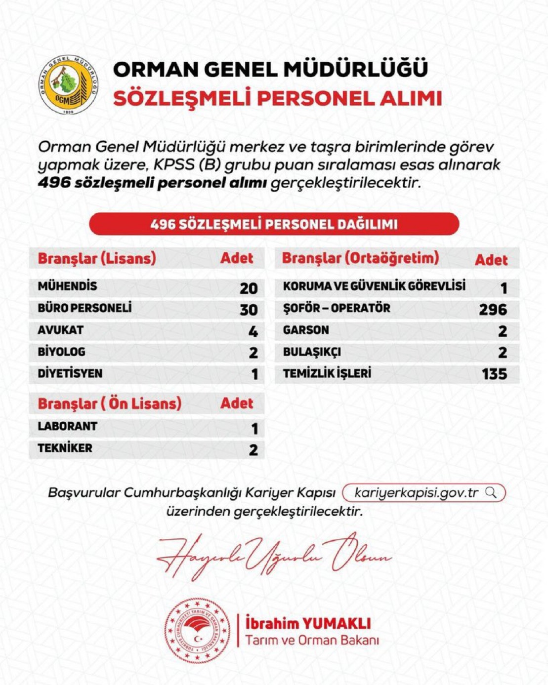 Başvurular, Cumhurbaşkanlığı Kariyer Kapısı üzerinden gerçekleştirilecek. Tarım ve Orman Bakanı İbrahim Yumaklı, duyuruyu “Hayırlı ve uğurlu olsun” notuyla paylaştı.