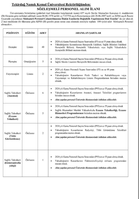 TEKİRDAĞ – Tekirdağ Namık Kemal Üniversitesi Rektörlüğü, Üniversite Birimlerinde İstihdam Edilmek Üzere Büyük Bir Personel Alım İlanı Yayımladı. 657 Sayılı Devlet Memurları Kanunu’nun 4/B Maddesi Uyarınca Görevlendirilecek Toplam 100 Sözleşmeli Personel İçin Başvuru Süreci Resmen Başladı. İlanda, Adayların Yazılı Veya Sözlü Sınav Yapılmaksızın Sadece 2024 KPSS Puan Sıralamasına Göre Belirleneceği Duyuruldu.