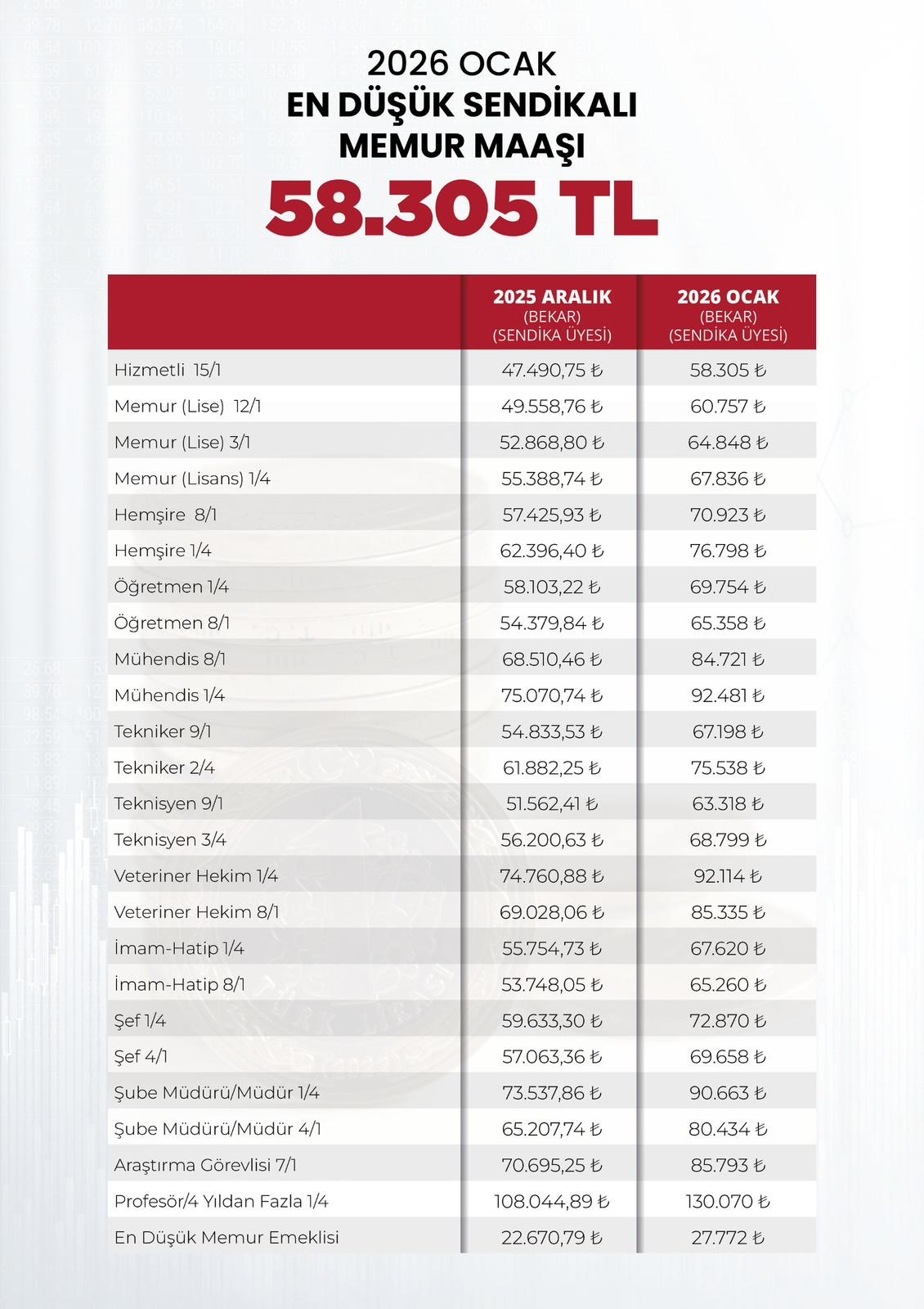 Memur maaş zamlarının netleşmesiyle birlikte milyonlarca kamu çalışanının 2026 yılı Ocak ayı itibarıyla alacağı güncel ücretler belli oldu. Memur-Sen tarafından paylaşılan verilere göre, enflasyon farkı ve toplu sözleşme kazanımlarıyla birlikte en düşük sendikalı memur maaşı 58.305 TL olarak açıklandı.