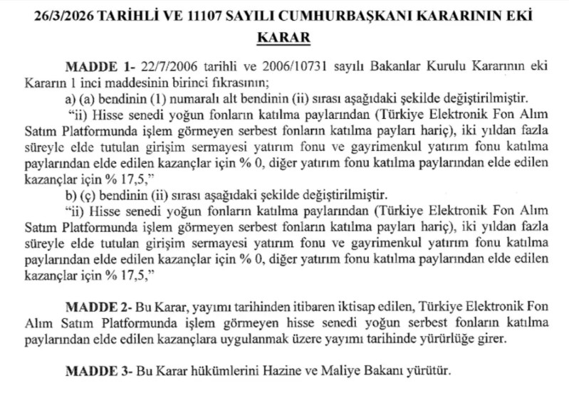 Resmi Gazete’de yayımlanan 11107 sayılı Cumhurbaşkanı Kararı ile yatırım fonlarının vergilendirilmesinde yeni bir dönem başladı. 27 Mart 2026 itibarıyla yürürlüğe giren düzenleme, özellikle serbest fonlar ve belirli yatırım araçları üzerindeki stopaj oranlarını yeniden belirledi. Karara göre, hisse senedi yoğun fonlar ile iki yıldan fazla süreyle elde tutulan girişim sermayesi ve gayrimenkul yatırım fonlarında uygulanan yüzde 0 vergi avantajı korunmaya devam edecek. Ancak bu istisna, Türkiye Elektronik Fon Alım Satım Platformu yani TEFAS bünyesinde işlem görmeyen serbest fonları kapsamayacak.